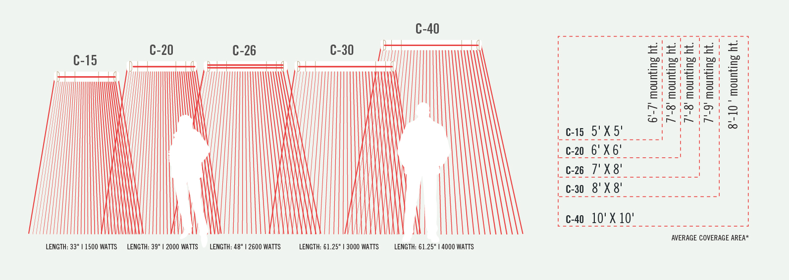 Introducing the Infratech C Series Single Element C2624MG 2600 Watts 240V 10.8 Amps Infrared Electric Patio Heater 48 x 8.19 x 2.5 in. Marine Grade Stainless Steel Color. This is a 2600 Watt 240 Volt 10.8 Amp heater. At 48 inches long, this heater will heat an area of 7 by 8 feet at a mounting height of between 7 and 8 feet. The C Series heaters may be surface or flush mounted, however, it is the preferred model for surface mounting due to its more slim and contemporary "C" shape. In comparison, the larger bodied W Series is better suited for flush mount installation, providing for better ventilation within the ceiling pocket. This heater is available in Stainless Steel and eight additional colors as well as a Marine Grade Option. Compatible controls for this heater are the Simple On/Off switch, the Input Regulators and all Custom Control options. Please keep in mind that the available Infratech heater voltages of 120, 208 and 240 are typical for residential properties, while 277 and 480 are more common for commercial. If you're not sure which voltage to choose, please consult with a licensed electrician. These heaters come with a full 3 year warranty from Infratech.